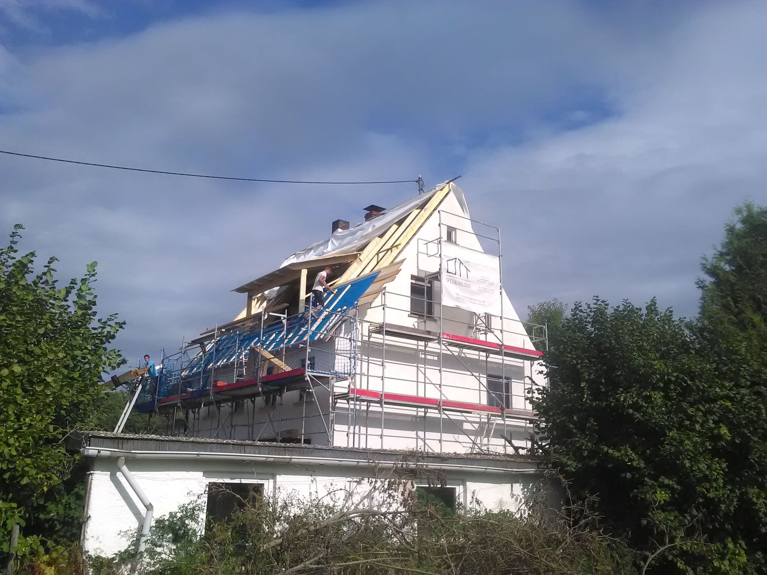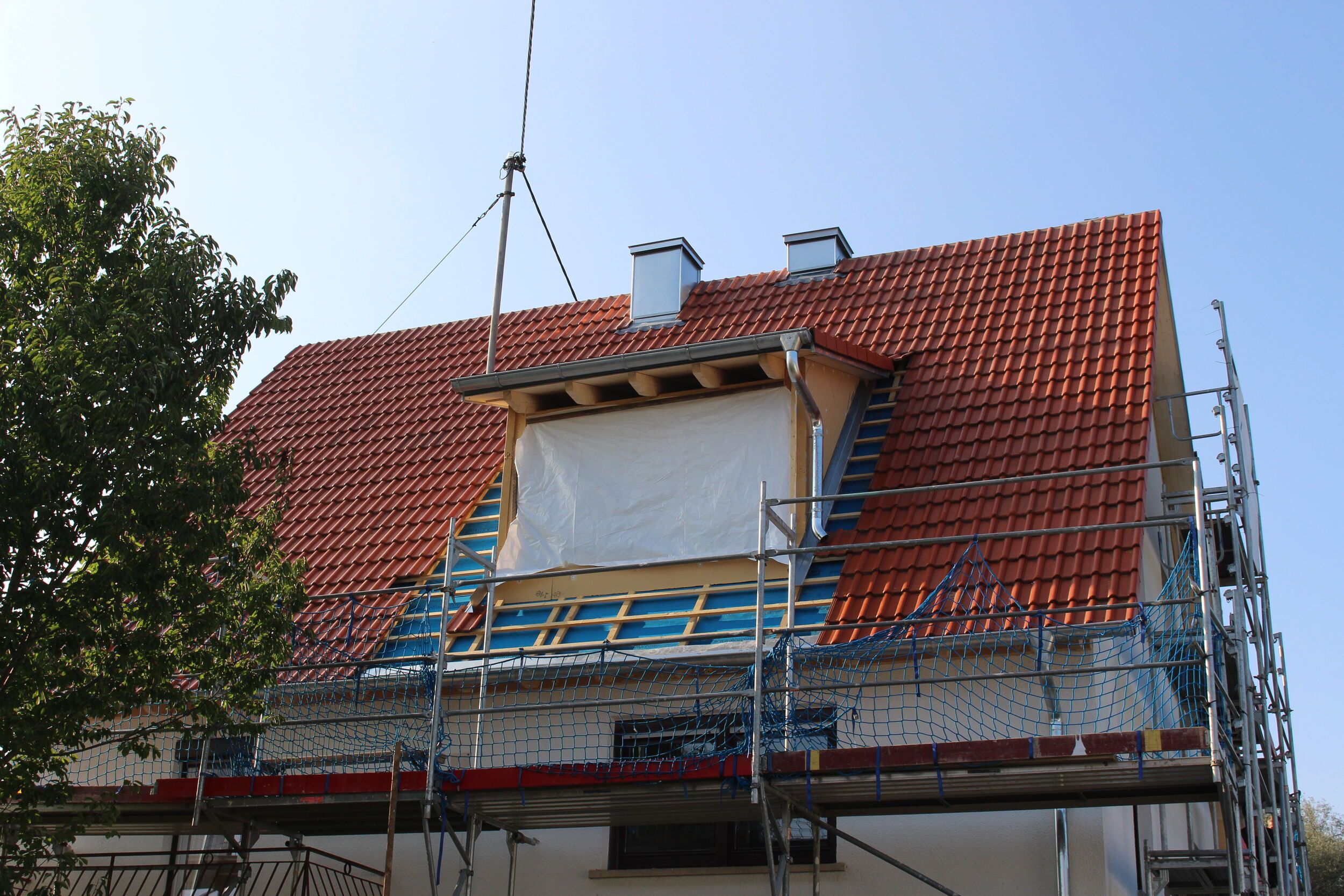 Hier wurde ein Einfamilienhausdach saniert, von der Aufdoppelung der Bestandssparren über die Wärmedämmung mit Cellulose bis hin zu zwei neuen Dachgauben für die Gewinnung an Wohnraum.